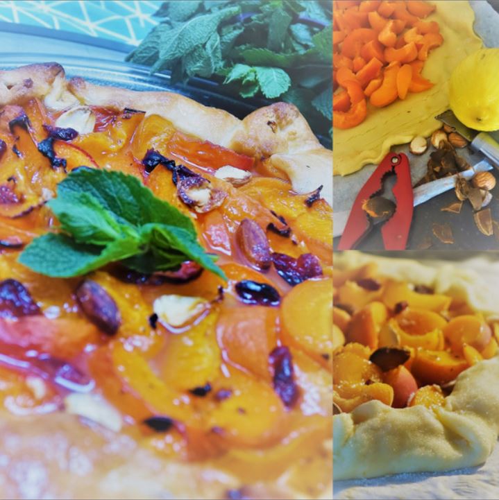 Dérouler une pate sablée à plat sur un papier cuisson posé sur la grille du four et recouvrir de 4 cuillères à soupe de poudre d'amande (qui absorbera le jus des abricots) Déposer en vrac au centre en laissant un bord large les abricots dénoyautés et coupés en morceaux Saupoudrer de sucre en poudre et parsemer d'amandes (et autres petits fruits secs si vous aimez) replier les bords de quelques centimetres sur tout le pourtour et mettre au four préchauffer à 180° pour 30mn Surveiller que le tour ne brule pas, et s'il s'assombrit trop le recouvrir d'un peu d'alu en laissant libres les abricots. Sortir la tarte du four. Mélanger un demi verre de sirop d'agave et 2g d'agar-agar, ajouter un brin de menthe et faire bouillir 2 mn Enlever le brin de menthe et étaler au pinceau le mélange sur toute la tarte, abricots et bords. Laisser prendre et servir froid.